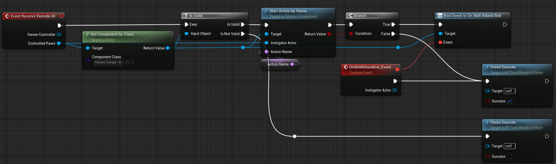 애니메이션이 끝나고 실행되게 Bind Skill Attack End를 선언, 공격에 대한 쿨타임이 존재하기 때문에 Action에 들어있는 Bool값을 호출하여 쿨이 돌았는지와 Action이 실행됬는지를 판별한다.
