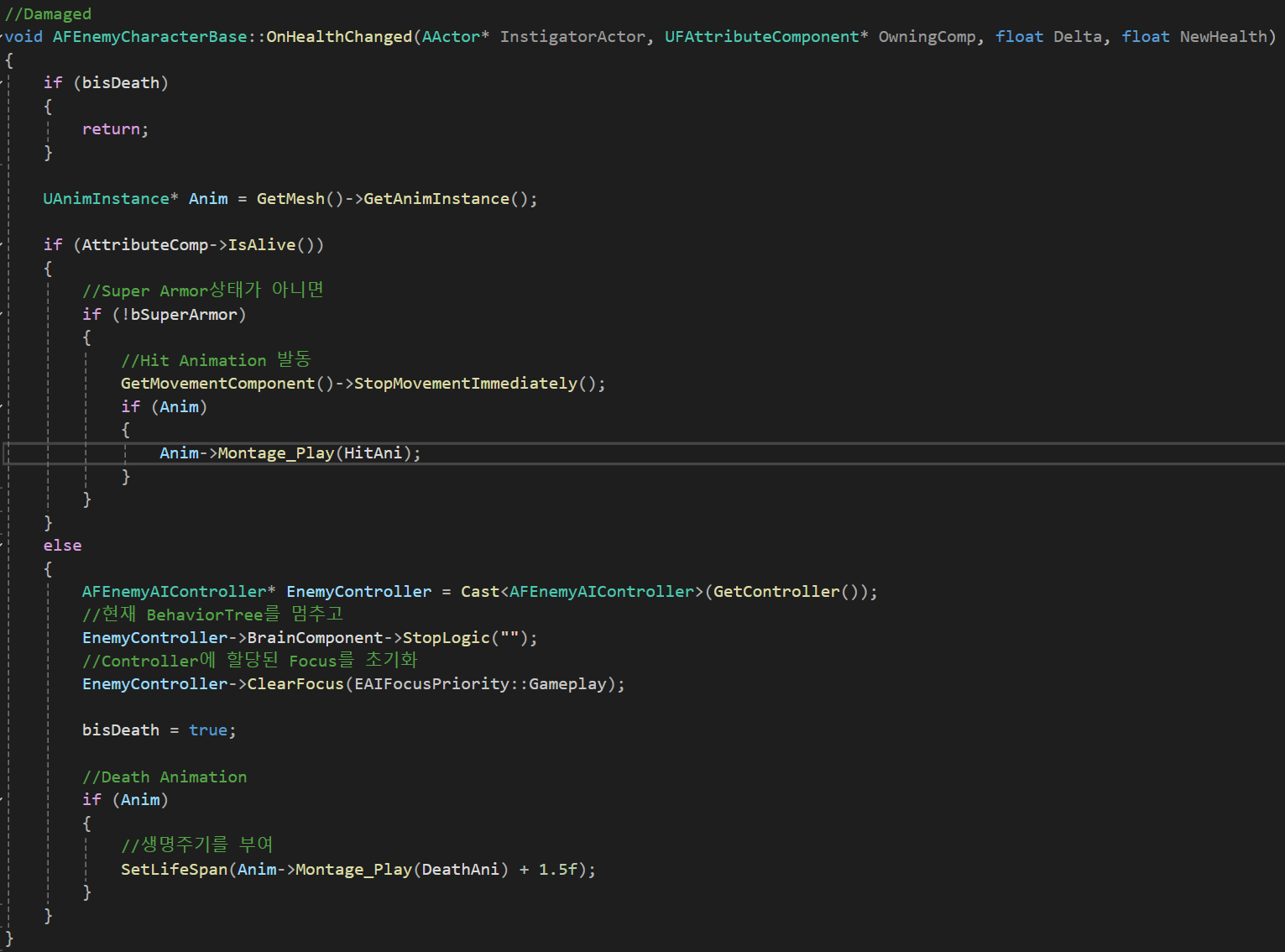 OnHealthChaged를 선언, Enemy가 죽었을 때 호출 불가능하게하고, Enemy가 SuperArmor인 경우를 추가하여 Elite몬스터 같은경우 공격이 캔슬되지 않게끔 만들었다.