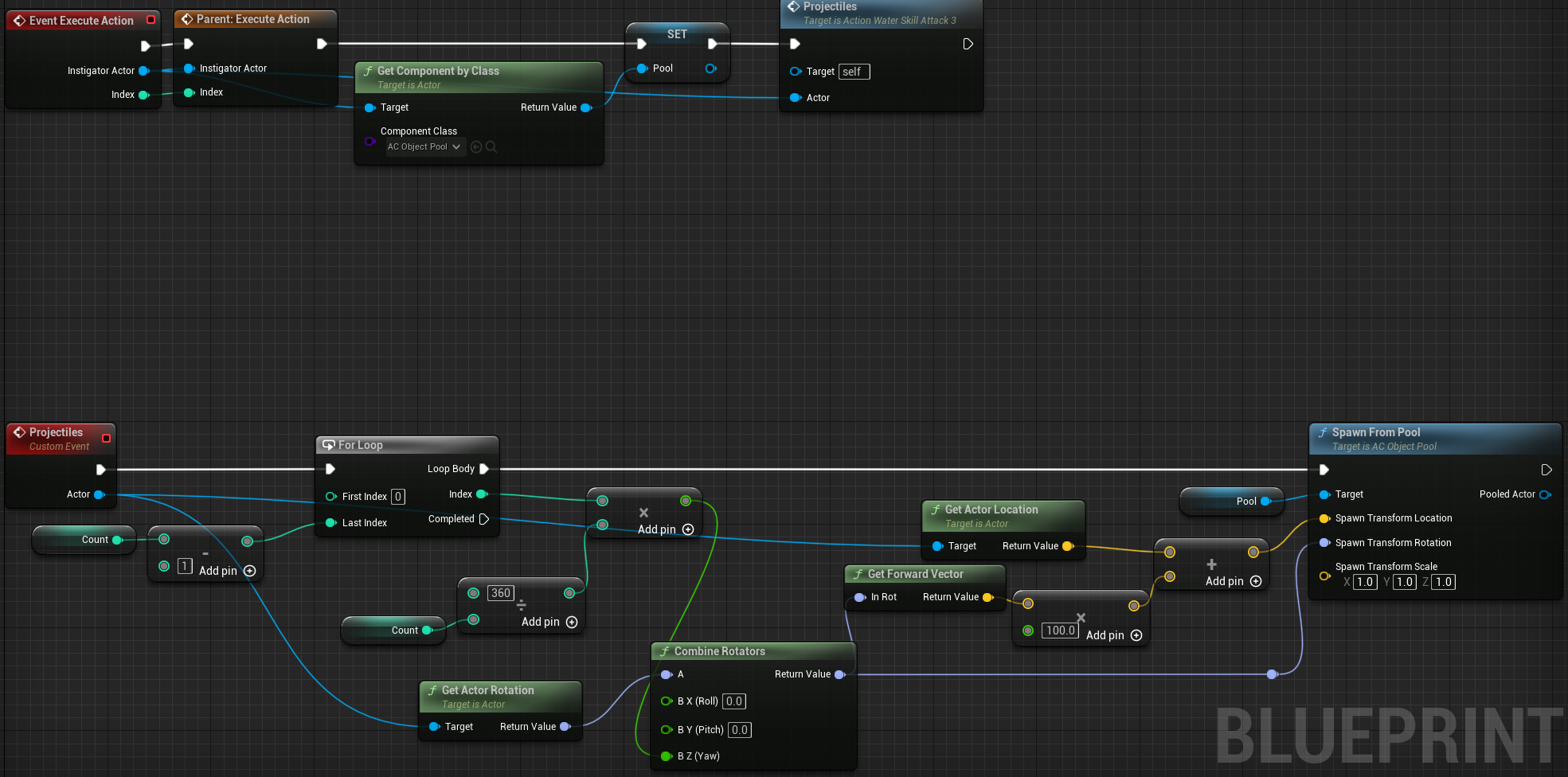 Count만큼 Projectile을 반복하고 Count에 따라 방향값을 구해 시계방향으로 Projectile이 생성된다.